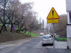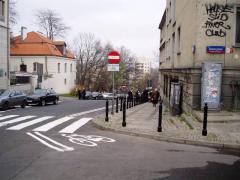 Początek pionierskiego kontrapasa na skrzyżowaniu ul. Oboźnej i Sewerynów. Tutaj zapewne przydałaby się wyspa kanalizująca.