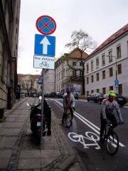 Koniec kontrapasa - dalej ulica Dynasy jest dwukierunkowa i ruch rowerów w obu kierunkach może odbywać się na zasadach ogólnych.