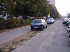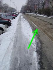 Na jednej z bielańskich ulic istniał kiedyś pas zieleni między chodnikiem a drogą dla rowerów. Na tym zdjęciu (z lutego 2005) widać, co z niego zostało po paru latach działania opadów deszczu i kół samochodów. W zeszłym roku miejsce to miało szansę przejść metamorfozę. Niestety, wystarczyło parę miesięcy, by ją zakończył powrót do stanu wyjściowego.