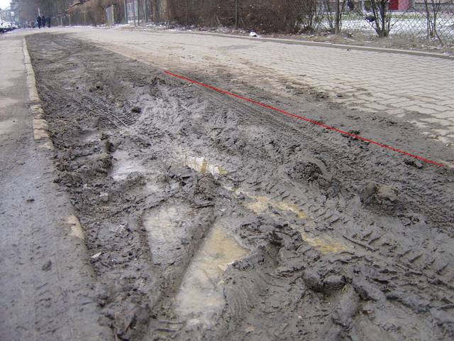 Grudzień - przynosi potwierdzenie obaw. Przed rekultywacją ubity piasek przynajmniej nie lepił się do kół. Teraz samochody nawożą rozwodnionym kompostem oba ciągi, chodnik płynnie przechodzi w błotnistą bryję.